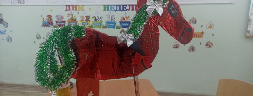 Центральной темой фотозоны стала елочка и символ 2026 года «Огненная лошадь», которую изготовила Глиздинская Ю. А., мама Глиздинской Киры. Своими руками ребята склеили гирлянду из цветной бумаги и украсили елку.