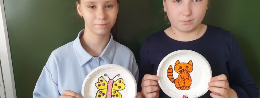 При изучении круп и макаронных изделий обучающиеся выполнили коллекцию в необычной для них форме, изготовили предметы шумового оркестра для уроков музыки. По теме «Посуда» выполнили украшение разделочной доски, чашки, стакана и роспись тарелочек с элементами техники папье-маше. Обучающиеся с большим удовольствием выполняют творческие работы.