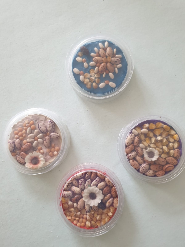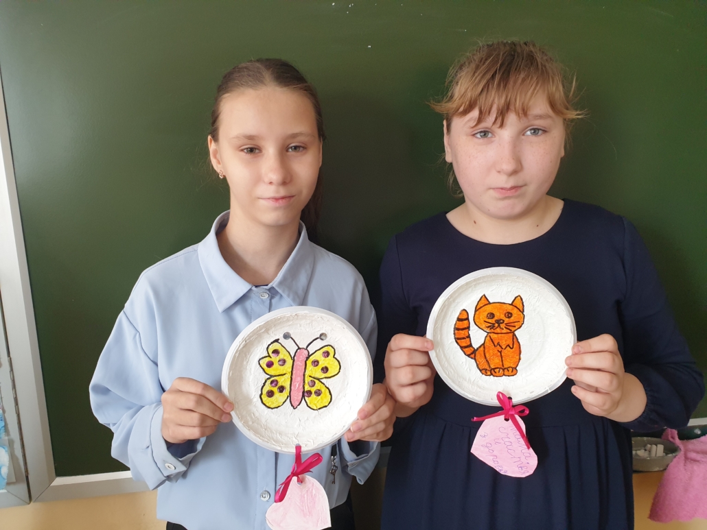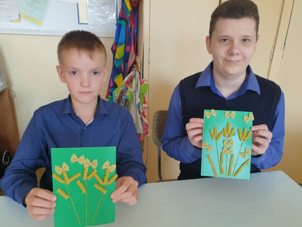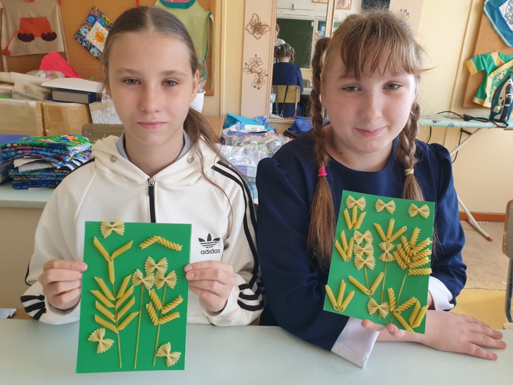 При изучении круп и макаронных изделий обучающиеся выполнили коллекцию в необычной для них форме, изготовили предметы шумового оркестра для уроков музыки. По теме «Посуда» выполнили украшение разделочной доски, чашки, стакана и роспись тарелочек с элементами техники папье-маше. Обучающиеся с большим удовольствием выполняют творческие работы.