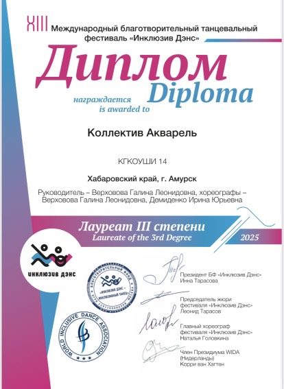 В июне 2025года педагоги Верховова Галина Леонидовна и Демиденко Ирина Юрьевна подали очередную заявку на участие в конкурсе Инклюзив Дэнс. Наш танец «Русская рать» уже отличился на краевом фестивале. Но и на международном уровне наши труды были оценены. Организаторами конкурса мы были лично отмечены!!!