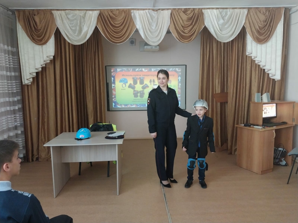 Анна Владимировна принесла с собой и продемонстрировала ребятам специальную экипировку, защищающую водителя на дороге: шлемы, перчатки, наколенники, налокотники. Некоторые школьники пожелали примерить на себе эти средства. Особое внимание Анна Федоровна уделила вопросу безопасности пешеходов в вечернее время, а именно наличию световозвращающих элементов на одежде, головных уборах, на обуви, рюкзаках детей, которые светятся в темноте и помогают увидеть водителям автотранспорта движущихся пешеходов на значительном расстоянии.