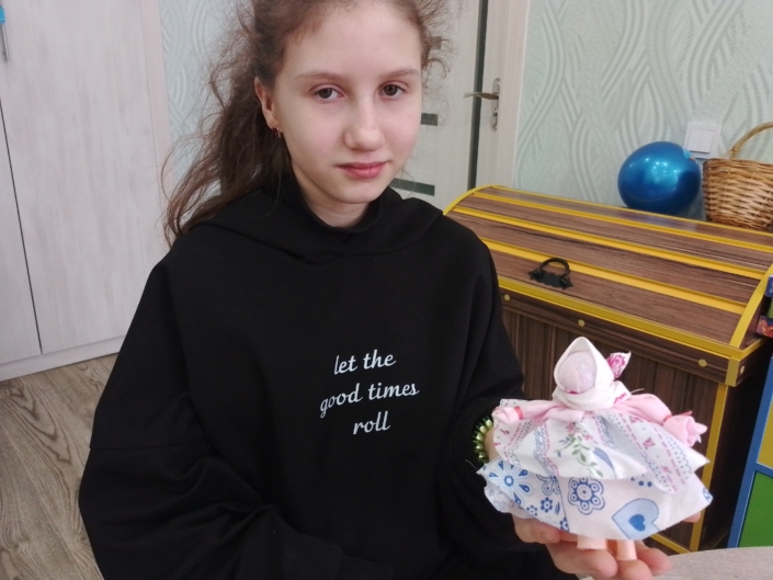 Девочки 7б, 10а и 12 классов познакомились с историей создания русской народной куклы Колокольчик. Название куклы связано с колокольчиком, колоколами. В древней Руси верили в то, что перезвон колокольчиков предвещает положительную энергию и хорошие добрые вести. Поэтому в каждом доме женщины делали таких кукол и верили, что их дом обойдут горести и печаль. Дети играли с таким куклами колокольчиками, оберегая свой дом. Размещенная у входной двери кукла оповещала хозяев о приходе гостей.